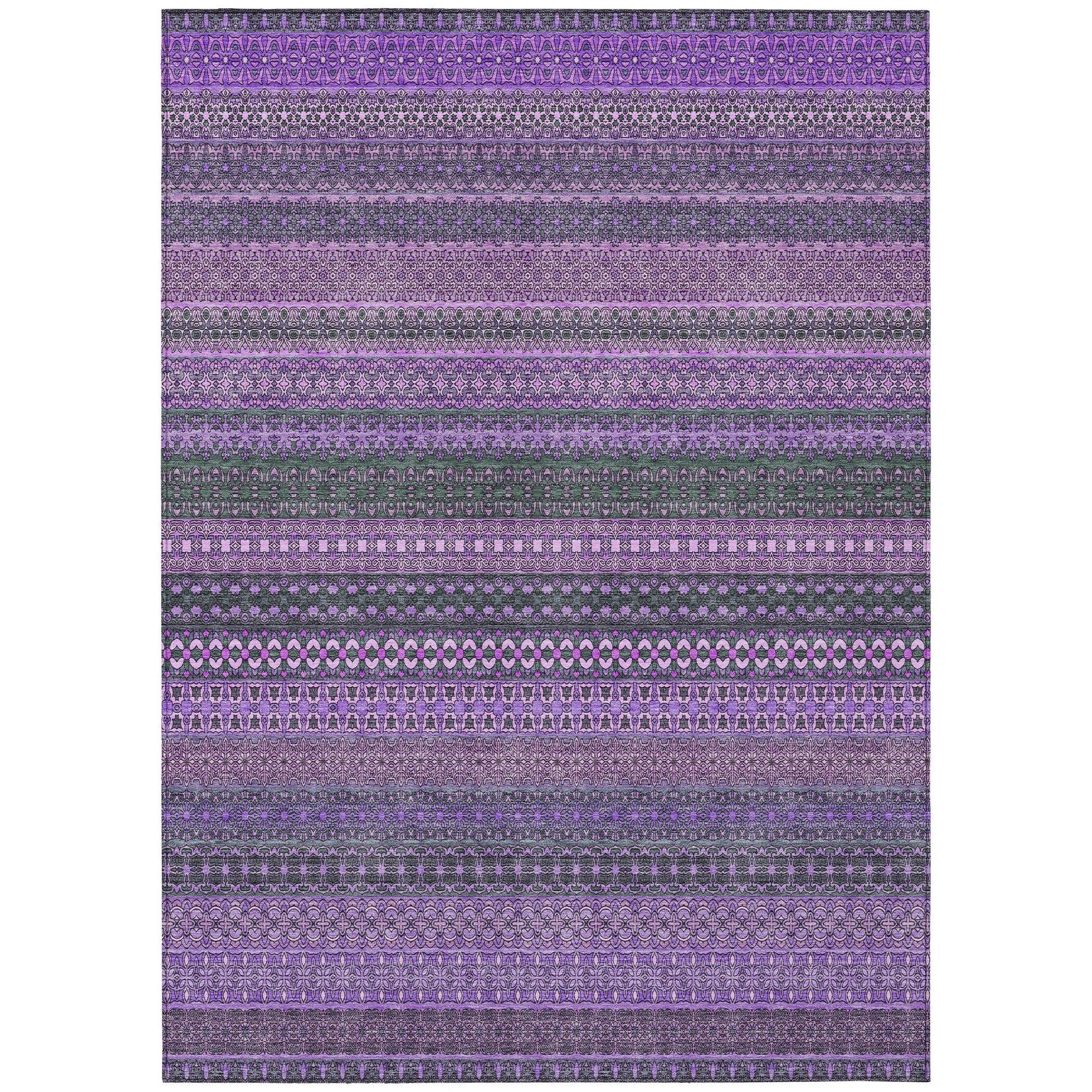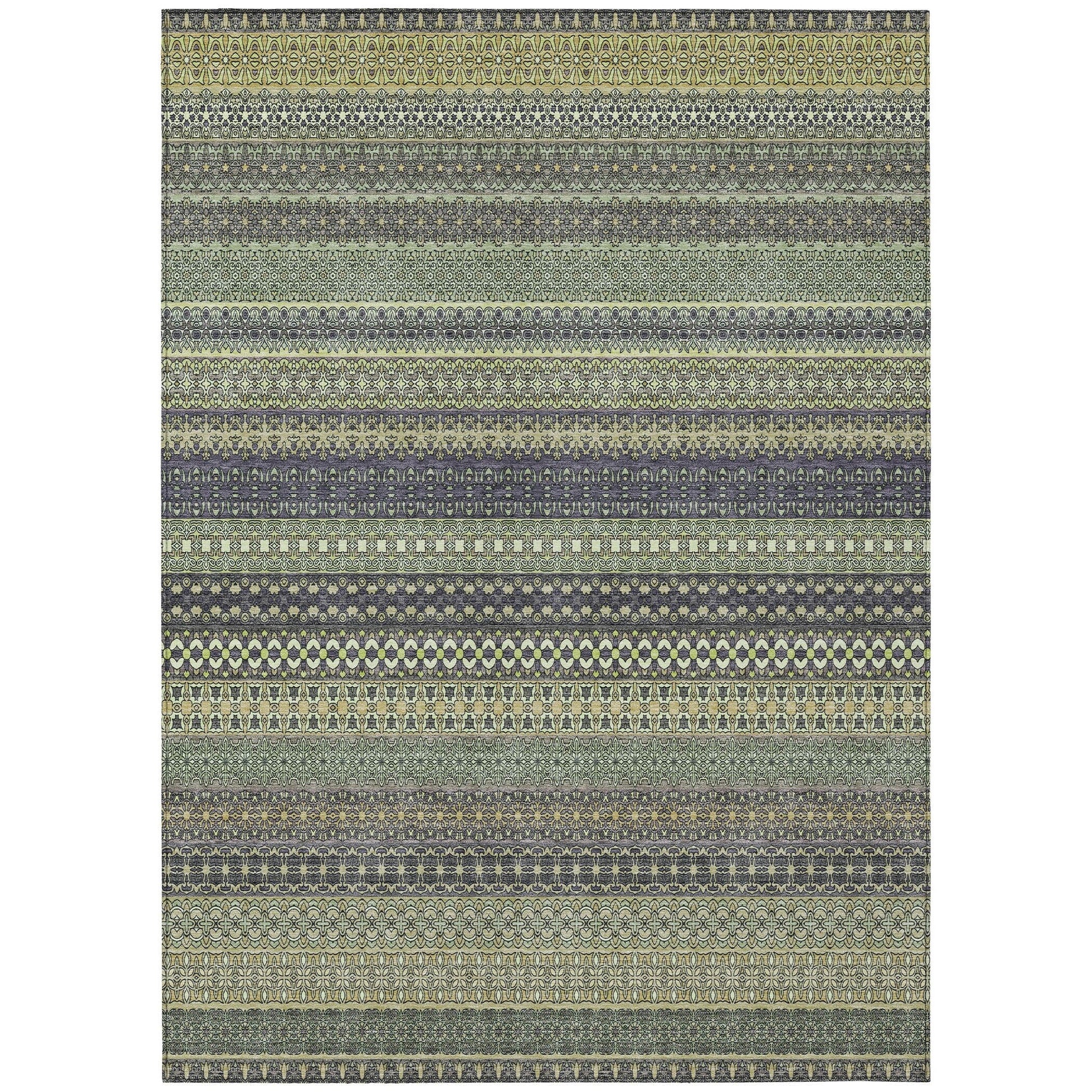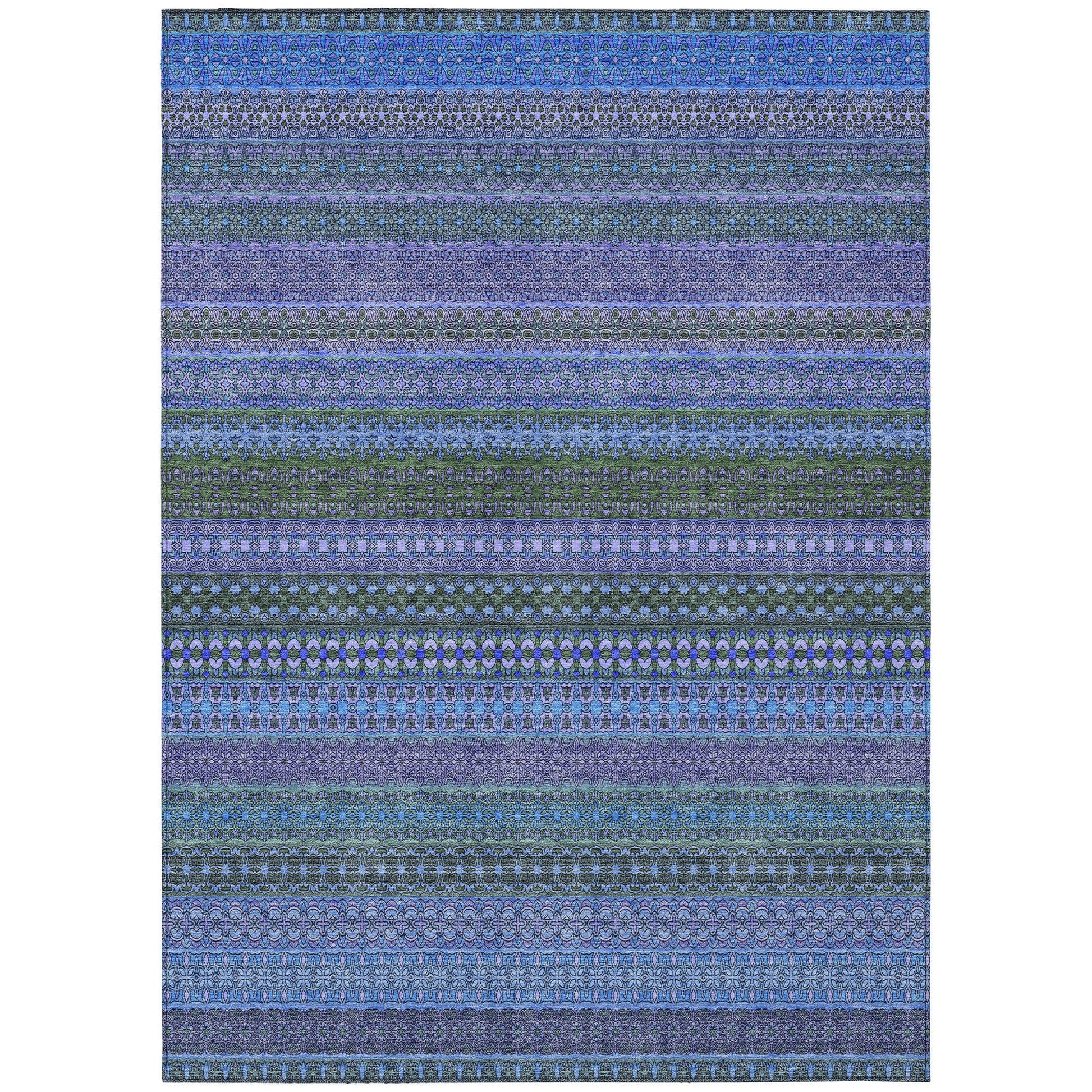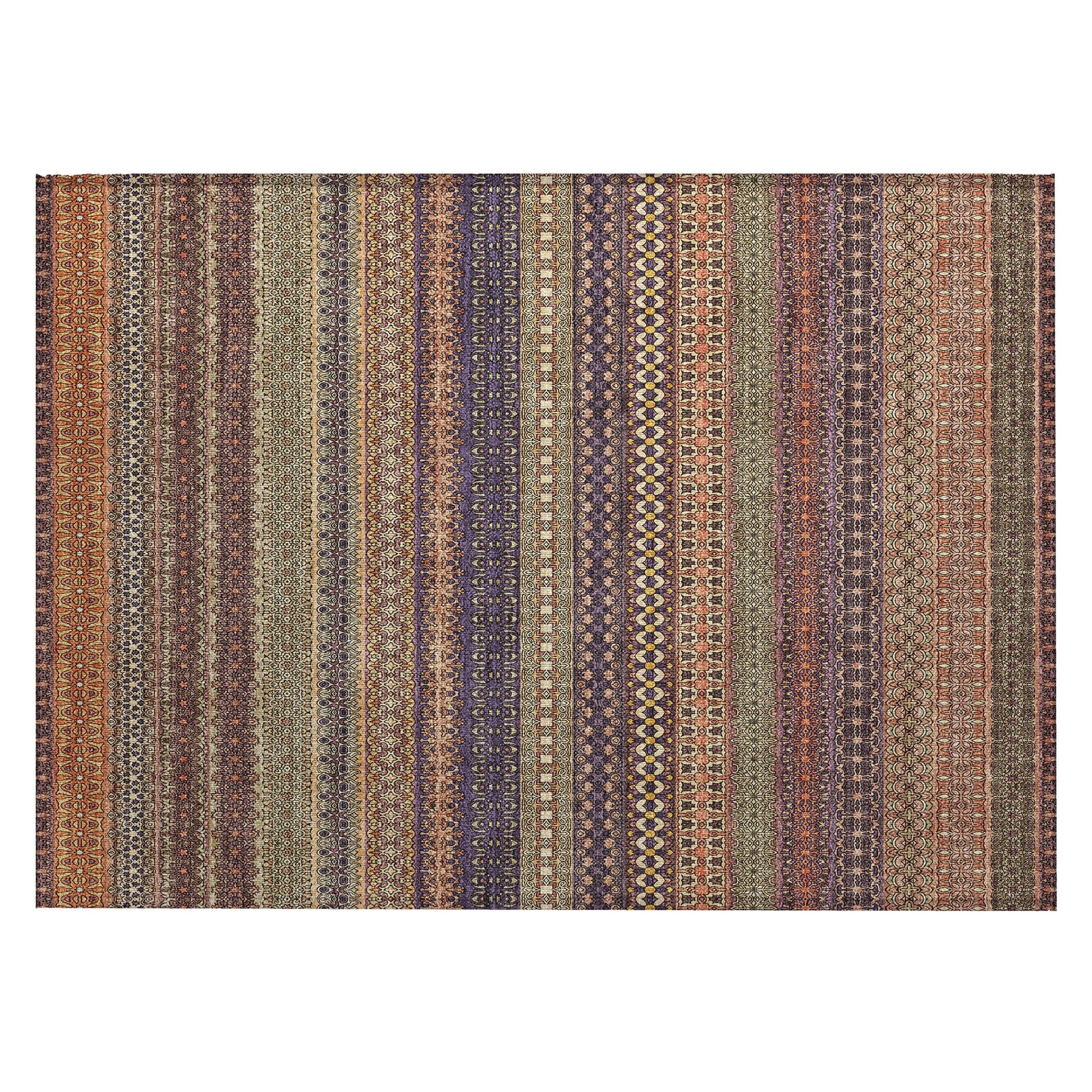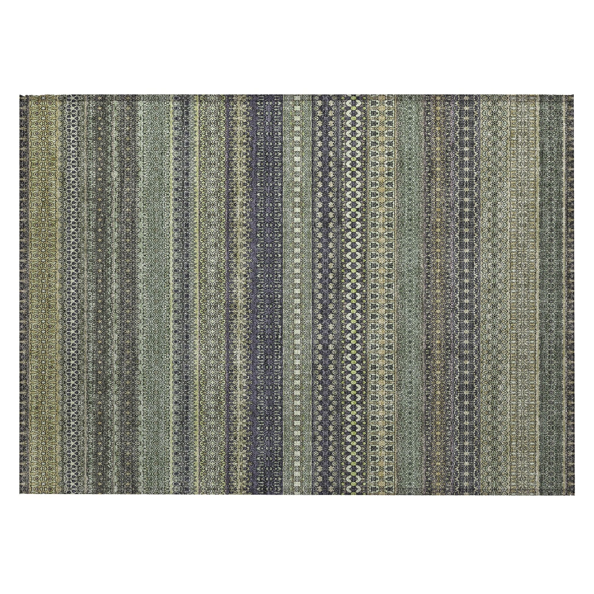 Elevate your decor with our area rug, showcasing an eclectic mix of shapes and motifs that add a whimsical touch to your floor. This transitional striped rug is a perfect blend of style and fun. With UV stabilization, it can be confidently placed indoors or outdoors. The ultra-thin construction includes an incorporated non-skid backing, providing stability and eliminating the need for a separate rug pad. The ultra thin profile allows for fast drying after a rainfall or outdoor cleaning. It's machine-washable and designed to be family and pet-friendly, making it a practical choice for any home. Larger rug sizes may not fit into a residential washing machine. They may be washed in a commercial size washing machine or hosed-off outside with mild soap and water. Air-dry, do not machine dry. All rugs exposed to long periods of intense and direct sunlight can experience loss of color over time. Our rugs perform best in covered outdoor areas and uncovered areas with lower hours of direct sunlight.