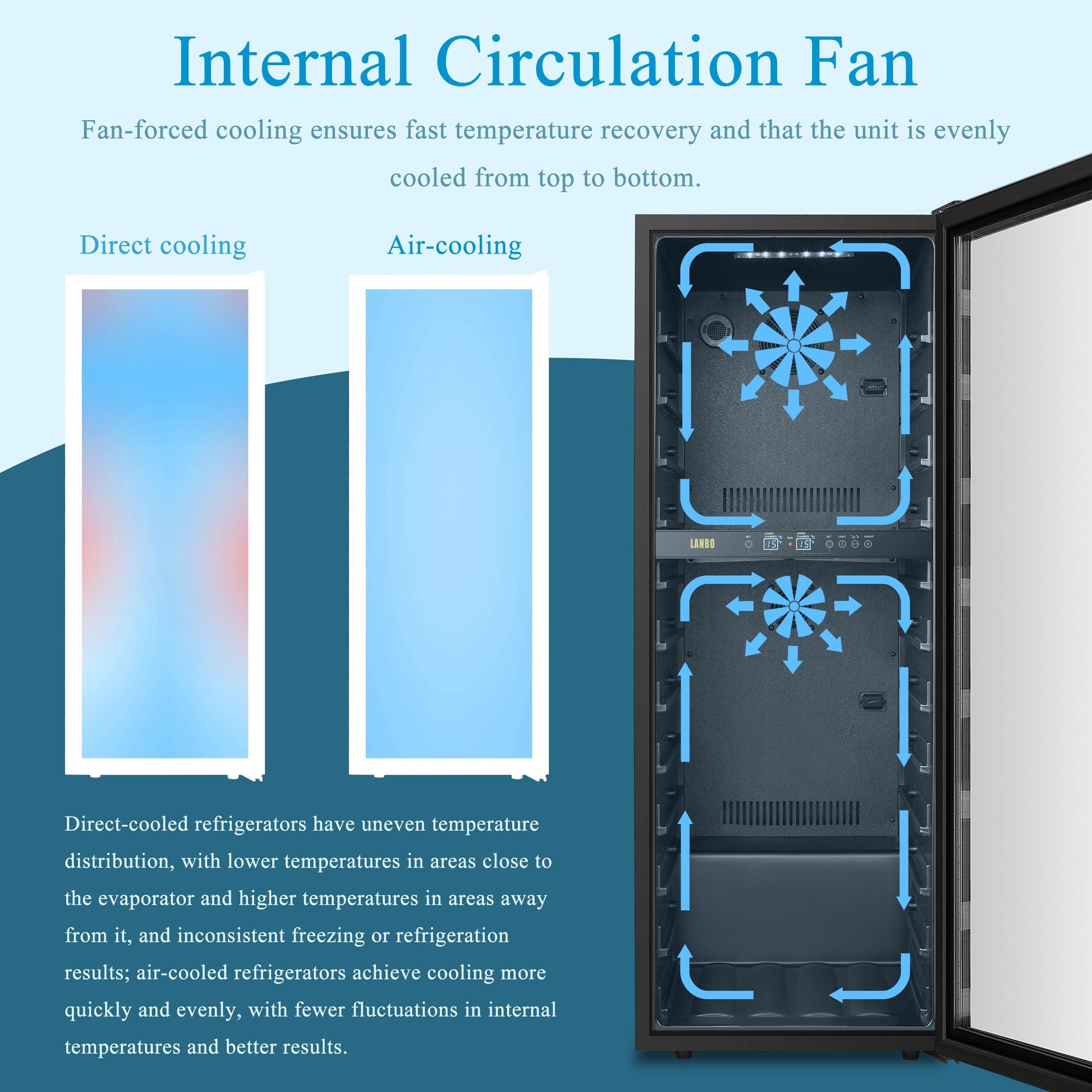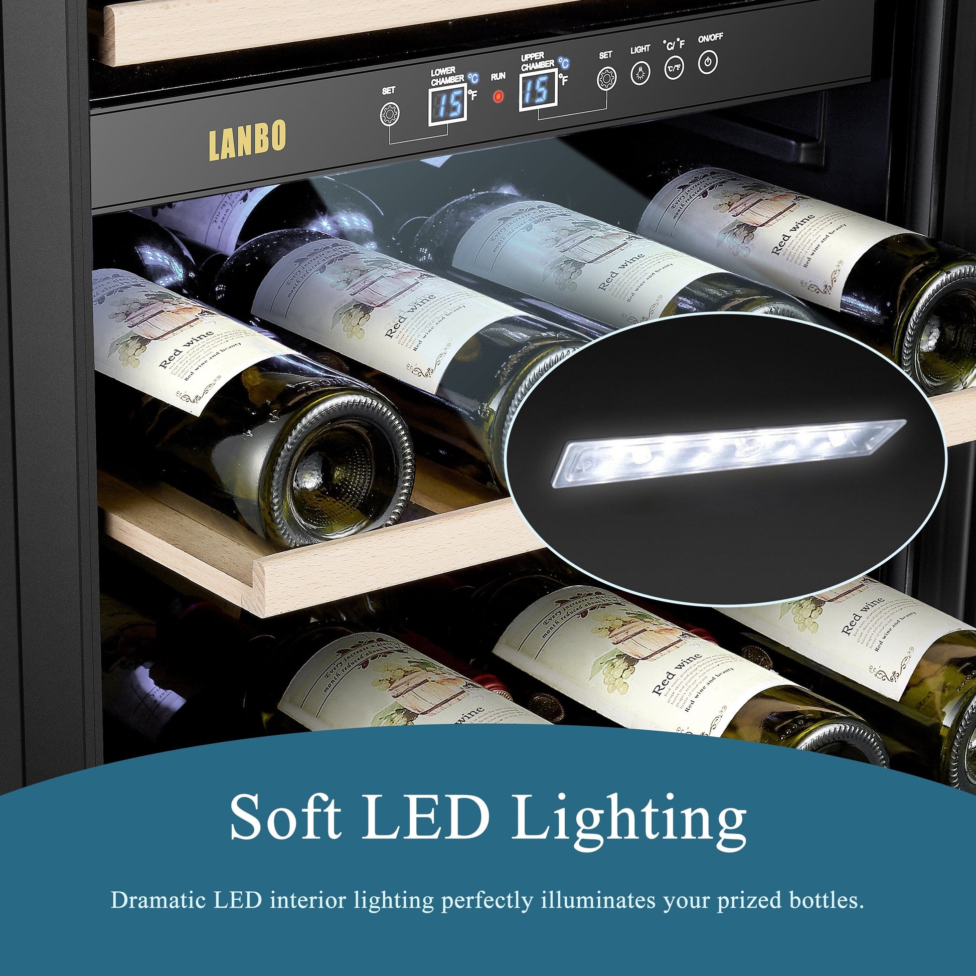 La cave à vin à double zone Lanbo LW80D combine le stockage à long terme et le refroidissement à court terme dans un appareil élégant et ultramoderne. La technologie de refroidissement par compresseur à faible consommation énergétique assure la stabilité de la température et une longue durée de vie pour protéger vos investissements. Le refroidissement à ventilation forcée garantit une répartition uniforme de la température et un rétablissement rapide de la température. Le panneau de commande numérique vous permet de régler la température entre 12°C et 18°C (54º et 64ºF) pour le vin rouge dans la zone inférieure et entre 5°C et 12°C (41º et 54ºF) pour le vin blanc et le vin mousseux dans la zone supérieure. 5 étagères en hêtre durable peuvent contenir jusqu'à 64 bouteilles de vin. La garniture en acier inoxydable s'intègre parfaitement à la porte en verre trempé double vitrage pour un aspect élégant, complété par une poignée professionnelle en acier inoxydable. La porte réversible par l'utilisateur comprend une serrure frontale pour sécuriser votre collection. Ce réfrigérateur à vin élégant illuminera et embellira n'importe quelle pièce.