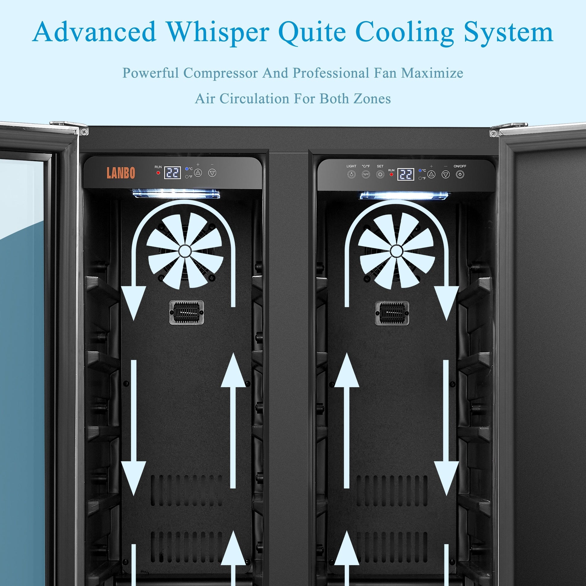 Lanbo Réfrigérateur à vin et à boissons de 24 pouces à double zone, pouvant contenir 18 bouteilles de vin et 55 canettes, en acier inoxydable et verre avec porte à ouverture française.