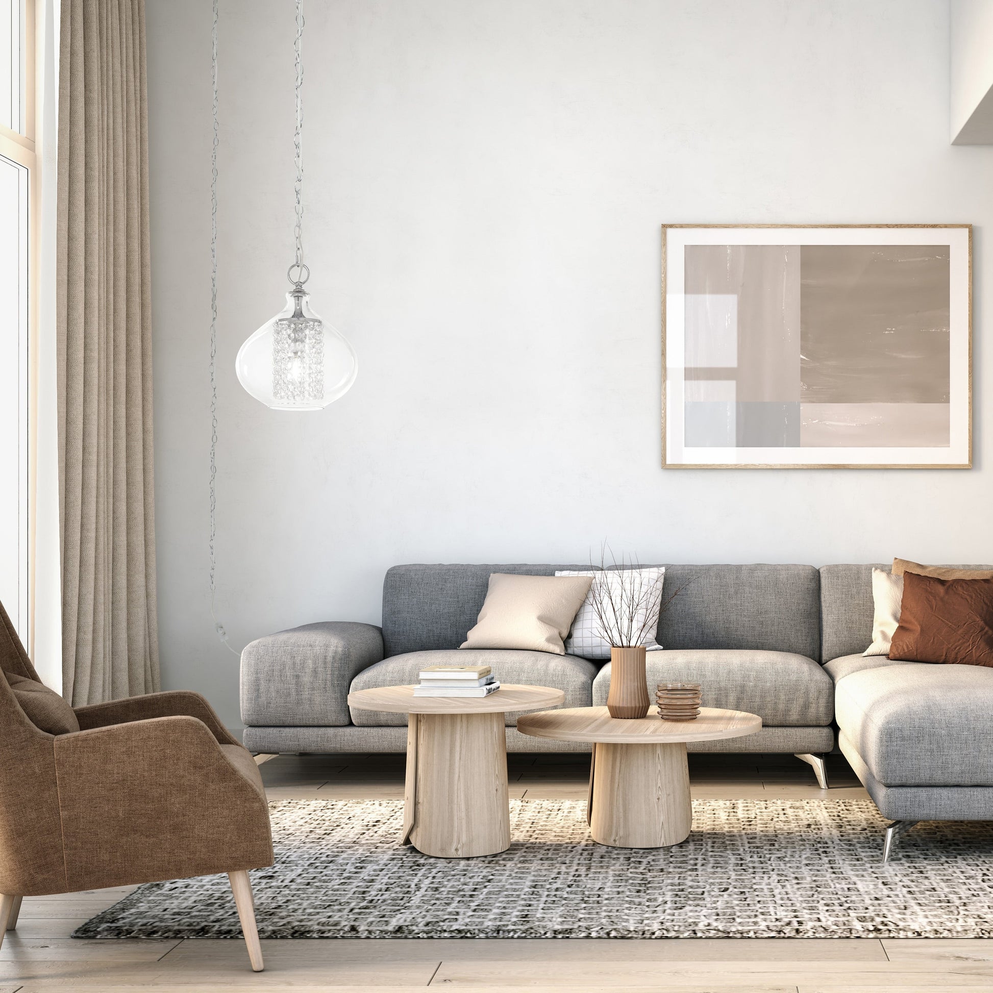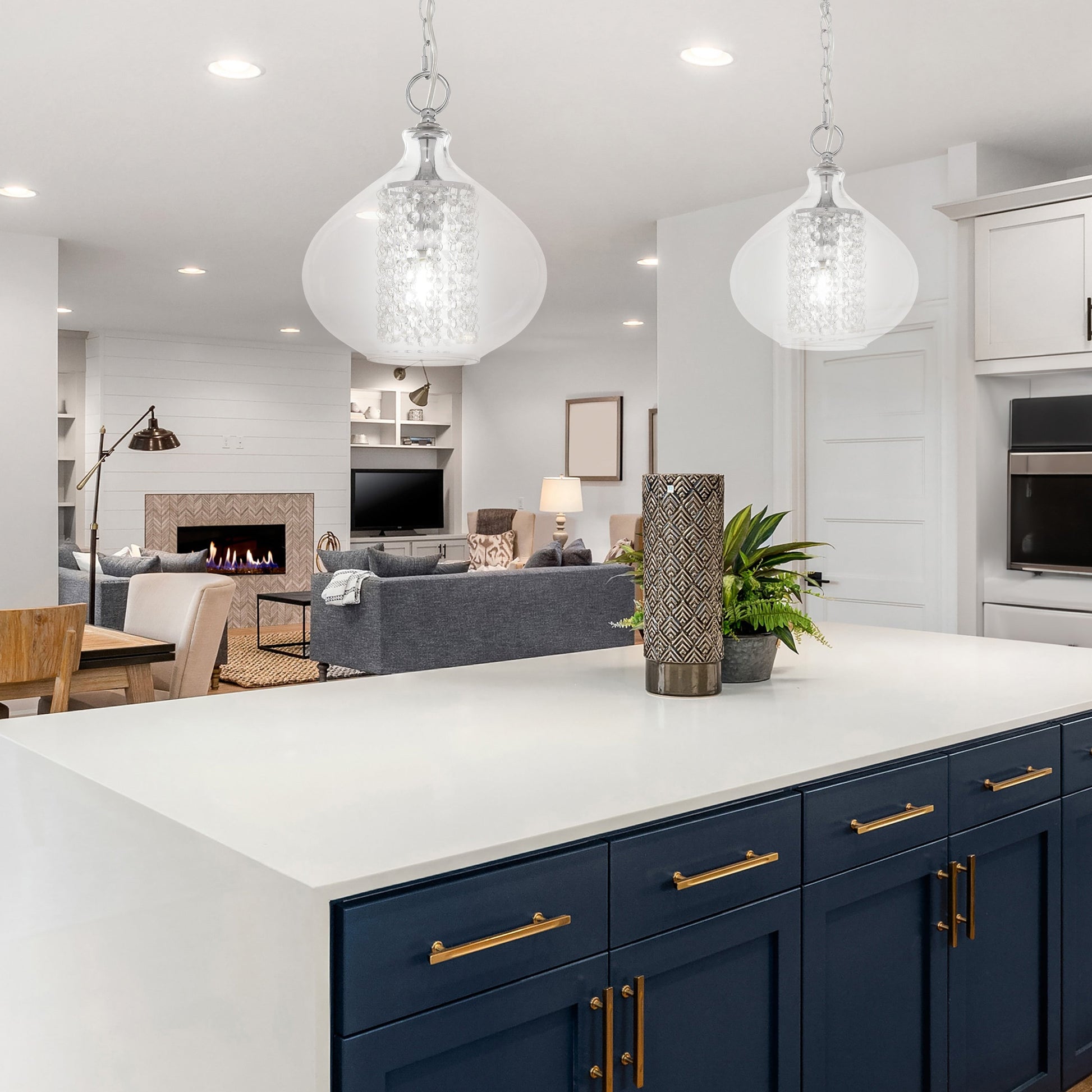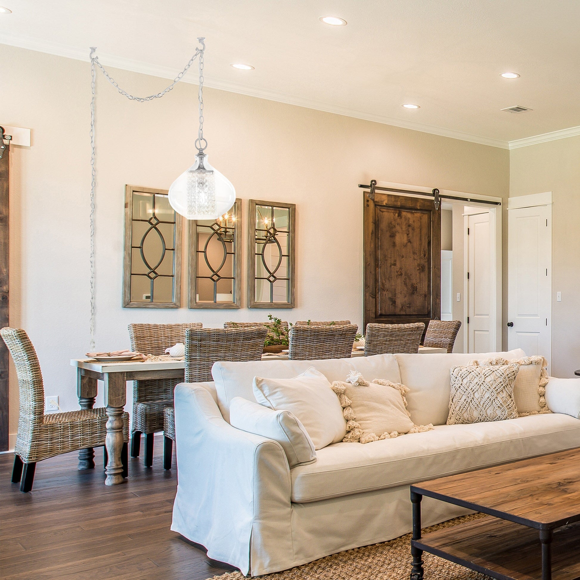 Add a touch of glamour to your home decor with Silver Orchid's Wallock hanging pendant. This stunning pendant features a hand-blown glass frame and 150 faceted K-9 crystal accents, creating a luxurious and elegant look. The smoke-colored transparent finish adds a modern touch, while the option to choose between hardwired or plug-in makes it versatile enough to fit any space.
